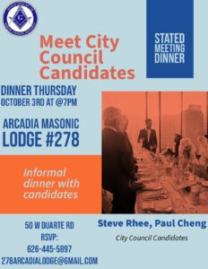 Flyer for Arcadia Masonic Lodge #278 Stated Meeting Dinner Come and meet the Arcadia City Council candidates Steve Rhee and Paul Cheng