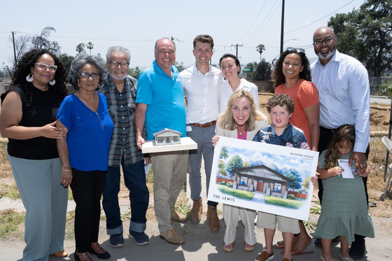 Members of the Wood family pose with supporters holding a model and rendering of their home design from The Foothill Catalog. Named from left to right: Jenine Wood, Carol Wood, Ken Wood Sr., Bryan Wong (SGV Habitat for Humanity), Alex Athenson and Cynthia Sigler (The Foothill Catalog Foundation), Supervisor Kathryn Barger, Lara Wood, Ken Wood Jr. and their children (Photo credit: David Franco/LA County)