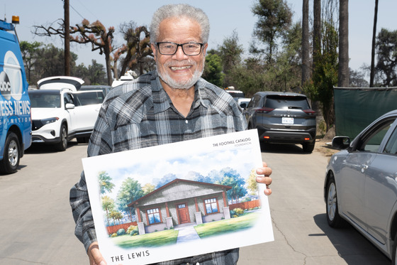 Eaton Fire survivor Ken Wood Sr. proudly holds a rendering of his future house design from The Foothill Catalog Foundation, “The Lewis.” (Photo credit: David Franco/LA County)